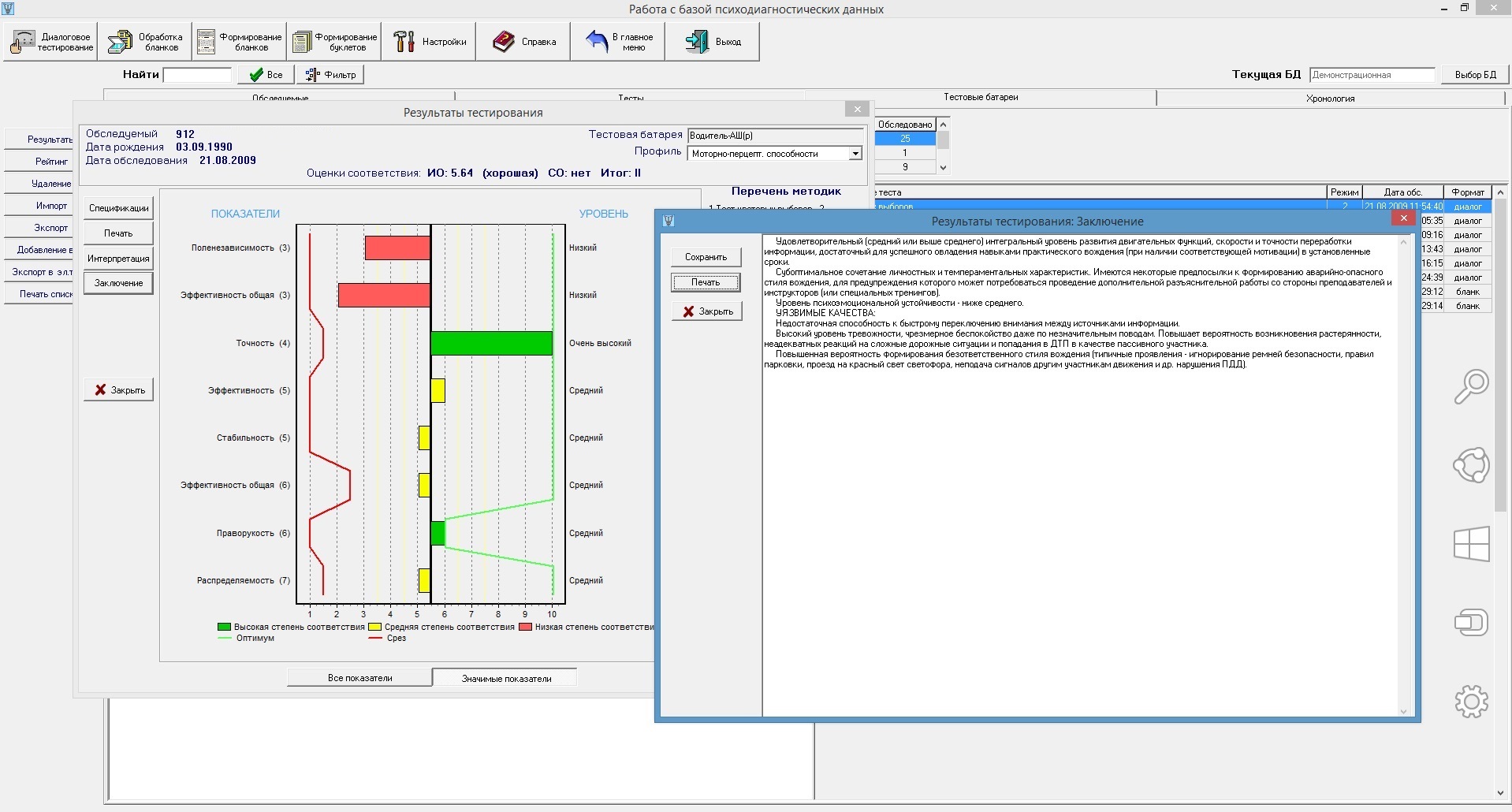 Тестовая библиотека включает в себя 55 психодиагностических методик, 4 готовые тестовые батареи для тестирования профессионально-важных качеств водителей автотранспортных средств (категории B, C, D и E) и 8 тестовых батарей для развития психофизиологических навыков (тестовые батареи особого типа для мониторинга динамики показателей относительно индивидуальной нормы).