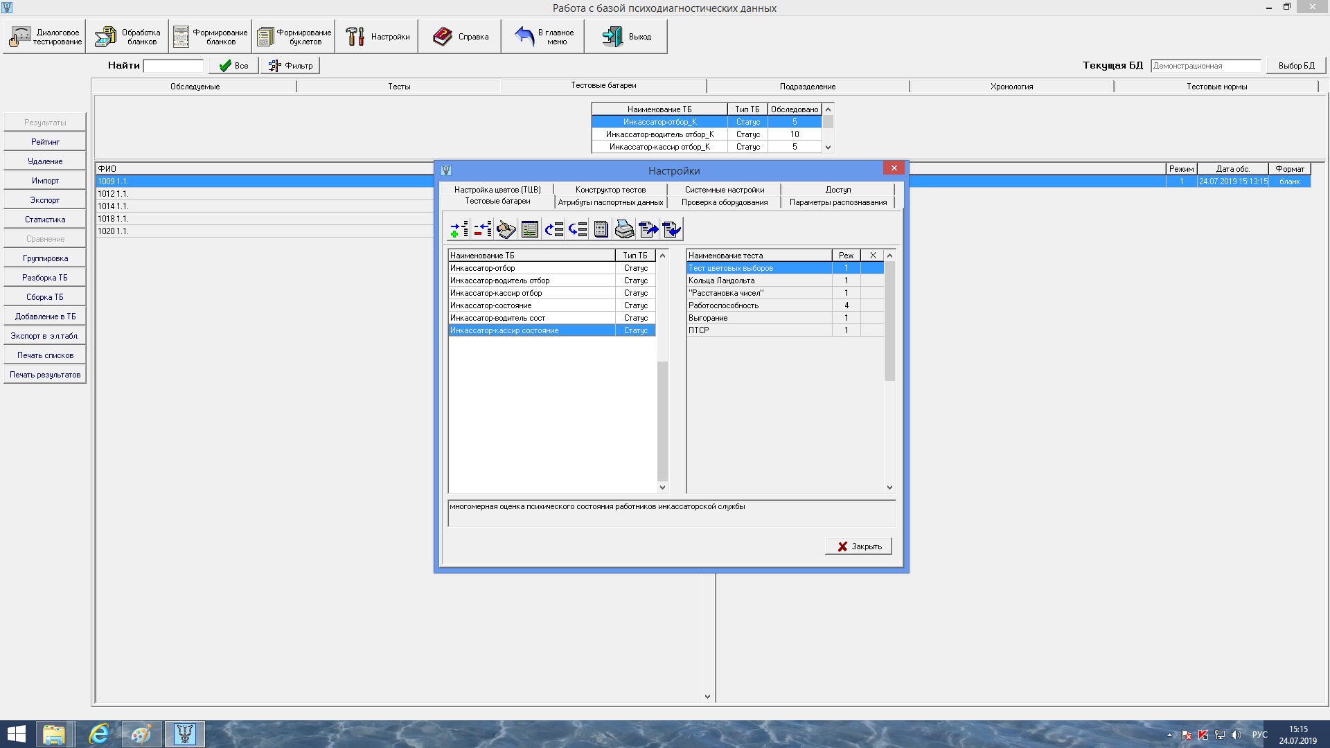 В данной модификации УПС «Мультипсихометр»® реализованы стандартные тестовые батареи базовой модификации УПС «Мультипсихометр»®, а также 6 оригинальных тестовых батарей в диалоговом и бланковом формате (для 3 категорий инкассаторской службы) с целью оценки необходимых профессионально важных качеств и текущей готовности к деятельности.