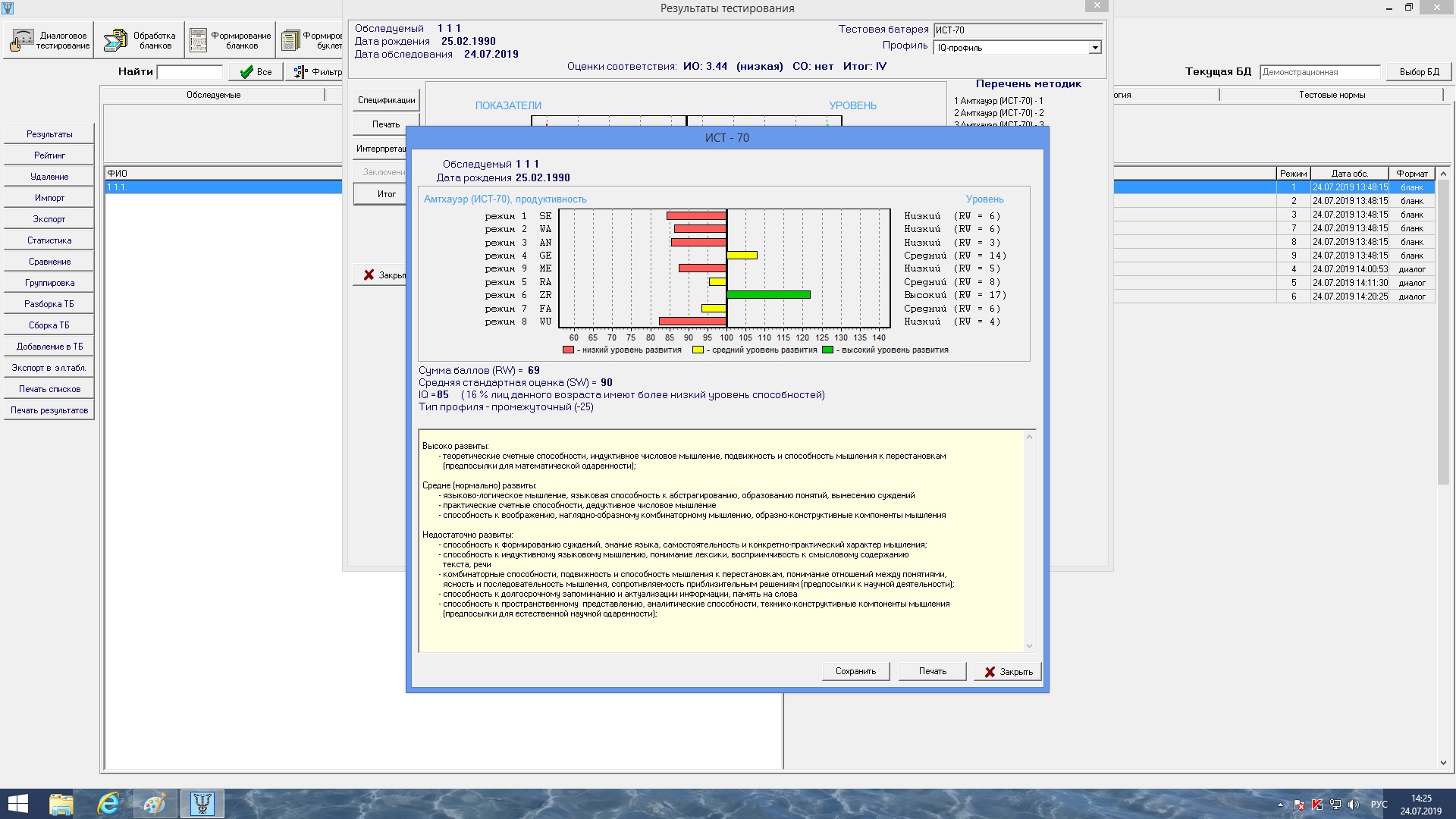 Тестовая библиотека включает в себя 125 психодиагностических методик, 5 готовых тестовых батарей, и состоит из нескольких тематических разделов, отражающих основные виды психодиагностической работы психолога: