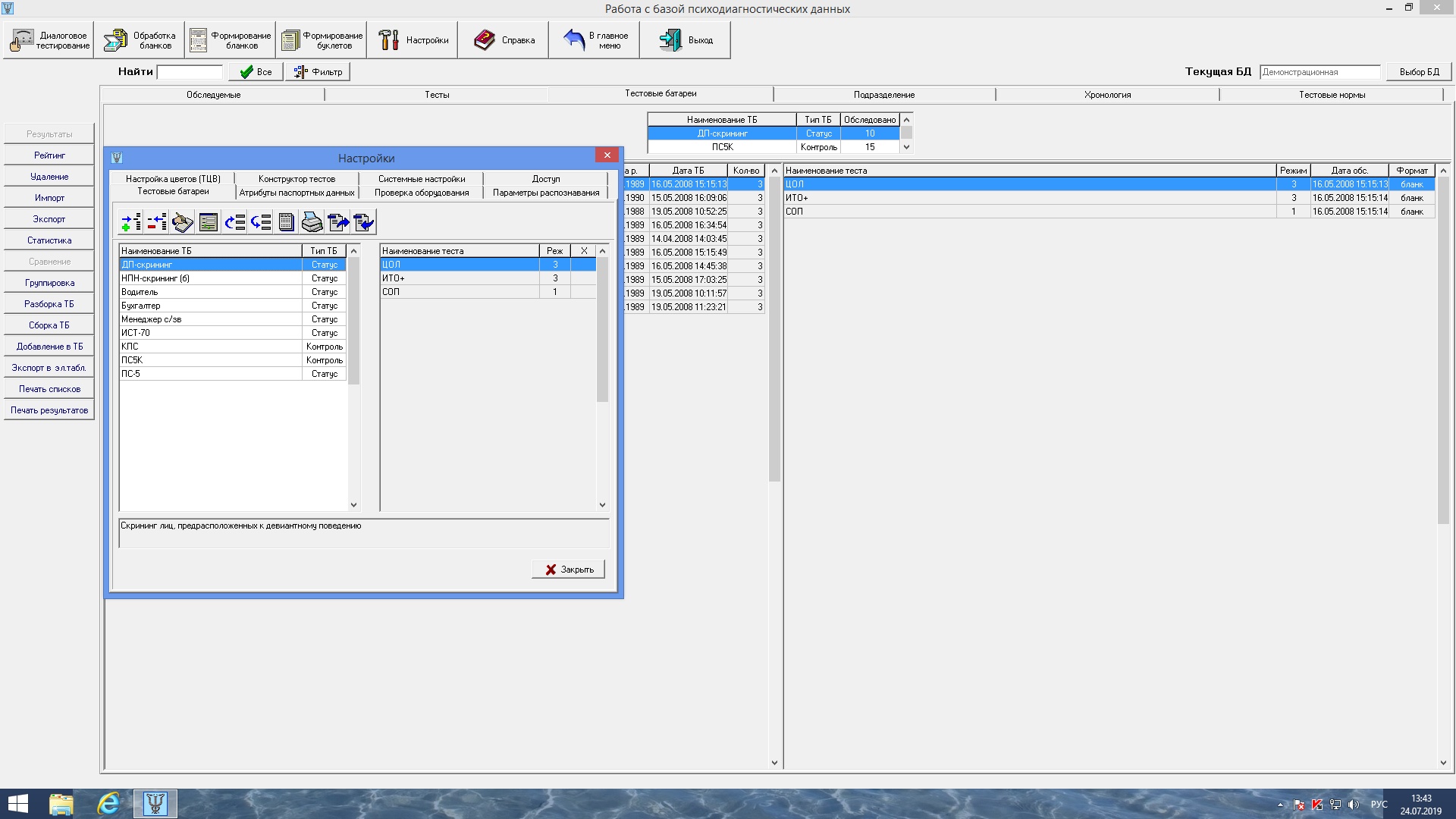 Стандартный набор тестовых батарей включает в себя тестовые батареи для оценки текущего психического состояния, для прогнозирования склонности к антисоциальному поведению, диагностики нервно-психической устойчивости, а также для профотбора на должности водителя, бухгалтера, менеджеров среднего звена и руководящих работников.
