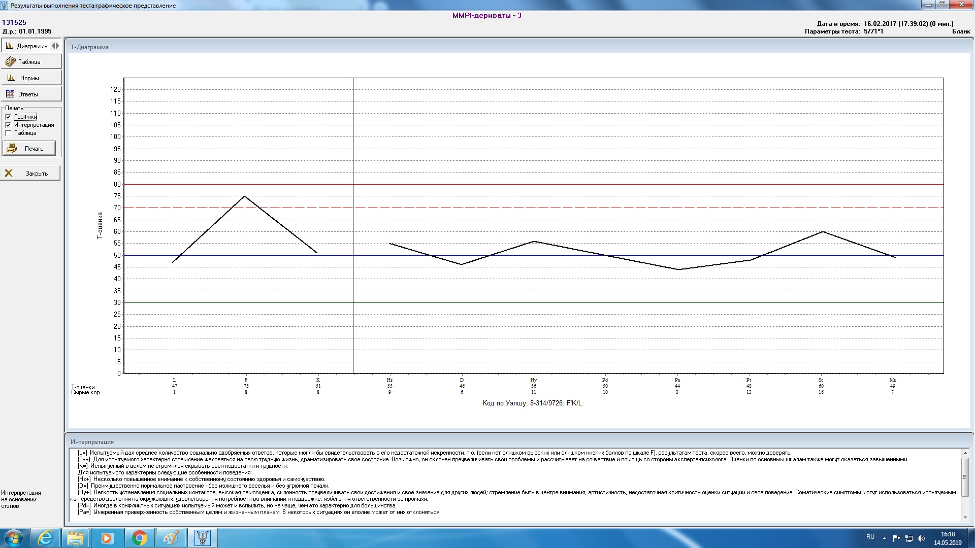 Окно результатов тестирования по методике «MMPI-дериваты» (3 режим) Окно результатов тестирования по методике «Шкала приемлемости» (1 режим) Окно результатов тестирования по методике «Полезависимость» (1 режим)