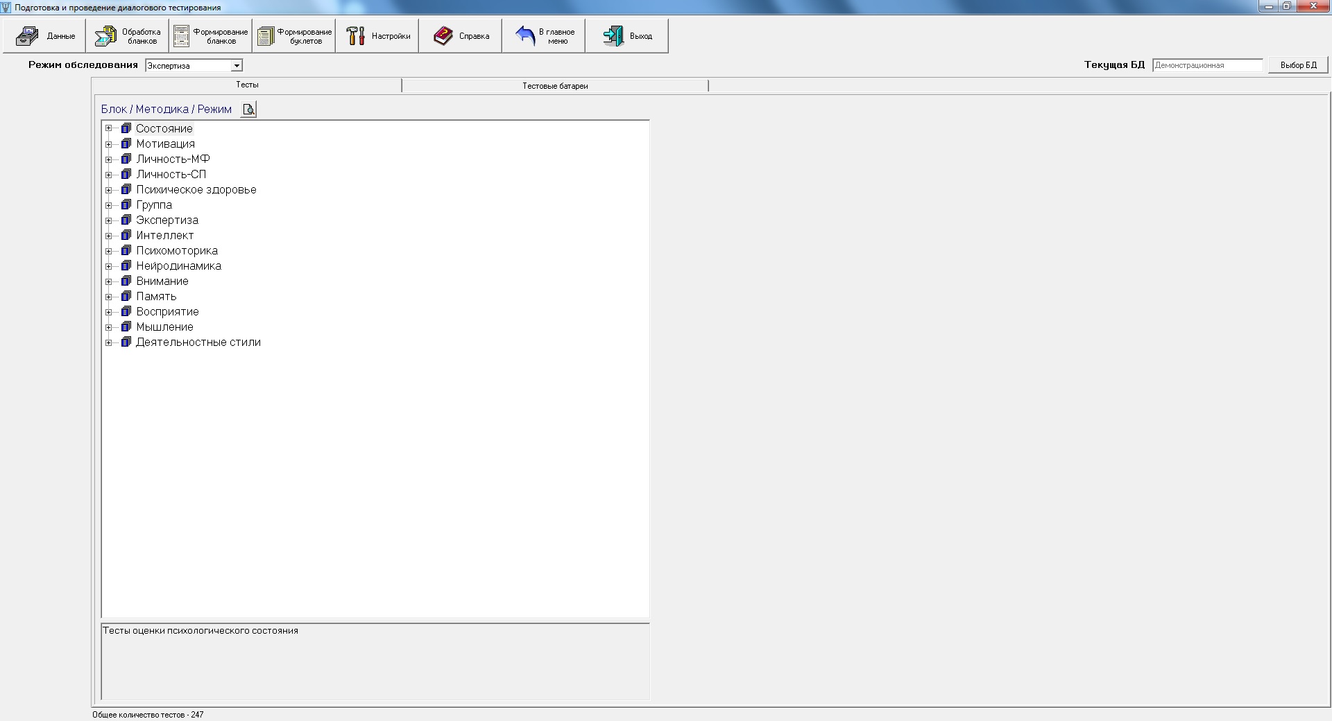 Всё методическое обеспечение УПС «Мультипсихометр»® скомпоновано в методические блоки в соответствии с практическим назначением и техническими особенностями тестовых процедур.