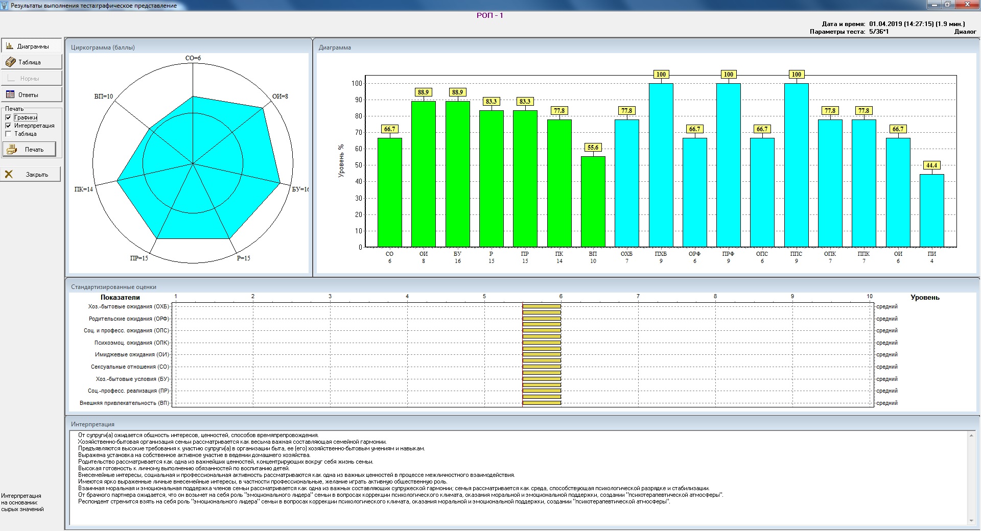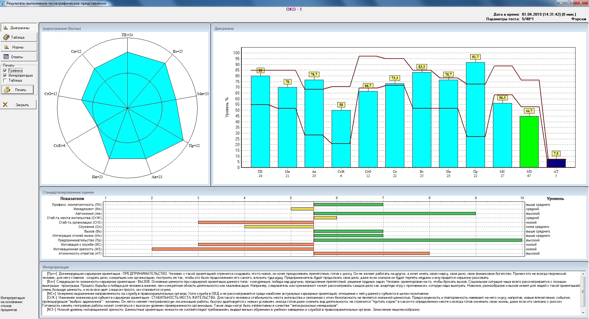 Окно результатов тестирования по методике «РОП» (1 режим) Окно результатов тестирования по методике «ОРО» (1 режим) Окно результатов тестирования по методике «ОКО» (1 режим)