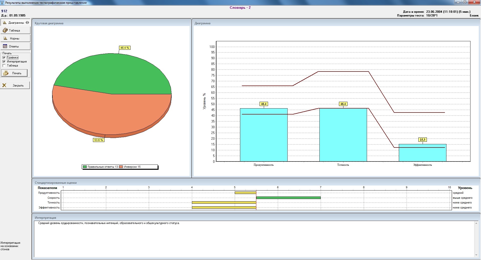 Тесты данного блока выполняются, как правило, с ограничением времени. Фактически для всех тестов блока возможен бланковый формат обследования. Для более объективной и надёжной оценки предпочтителен диалоговый формат, поскольку он позволяет ограничивать время выполнения и контролировать особенности поведения испытуемых автоматически.