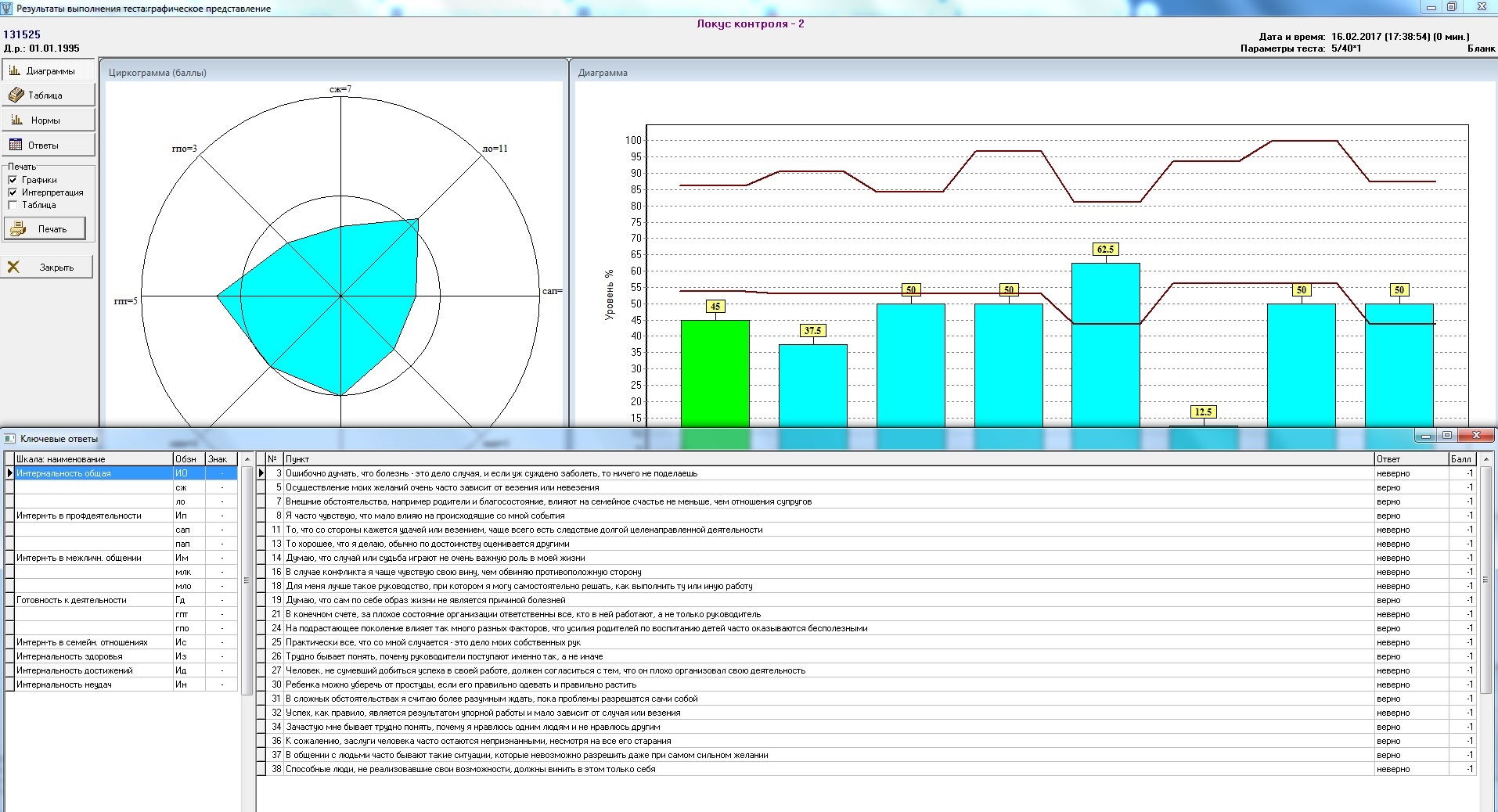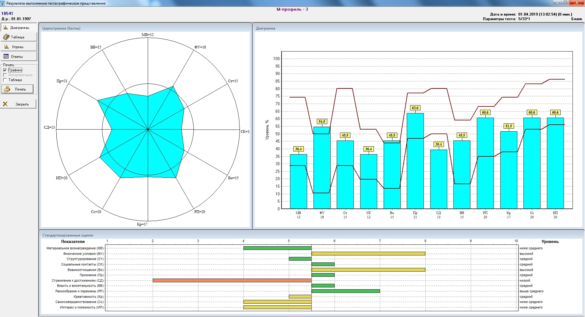 Окно результатов тестирования по методике «М-профиль» (1 режим) Окно результатов тестирования по методике «Локус контроля» (2 режим) Окно результатов тестирования по методике «М-профиль» (3 режим)