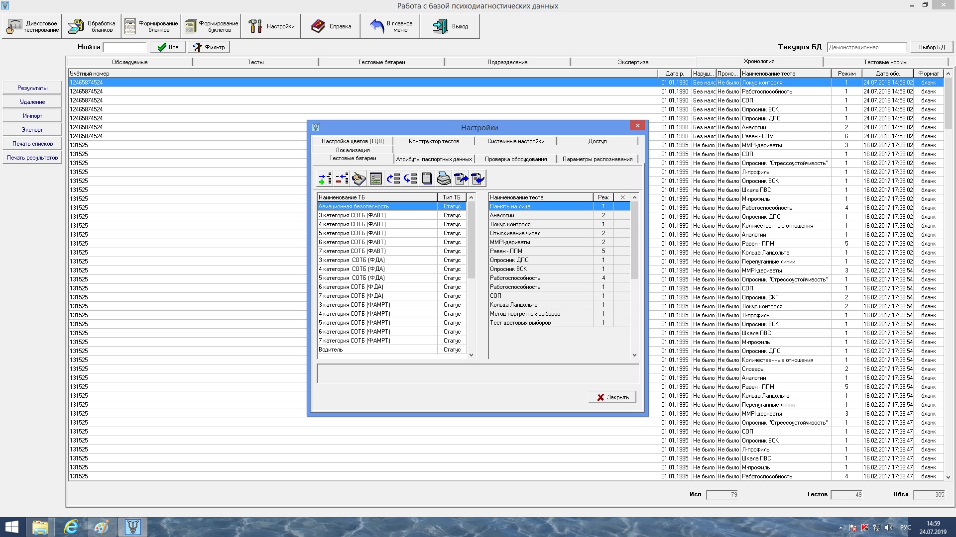 В данной модификации УПС «Мультипсихометр»® реализованы 17 тестовых батарей в диалоговом и бланковом формате (для каждой из подлежащих оцениванию категорий сил ОТБ с учетом специфики деятельности агентства) с целью оценки необходимых профессионально важных качеств, перечень которых установлен Приказом Министерства транспорта РФ от 21 августа 2014 г. N 231, и которым соответствуют интегральные показатели всех тестовых батарей (оценочные профили), имеющие краткие наименования: