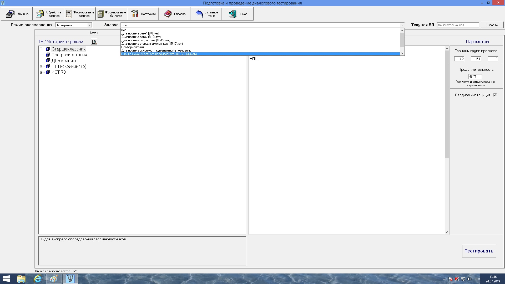 Тестовая библиотека включает в себя 125 психодиагностических методик, 5 готовых тестовых батарей, и состоит из нескольких тематических разделов, отражающих основные виды психодиагностической работы психолога:
